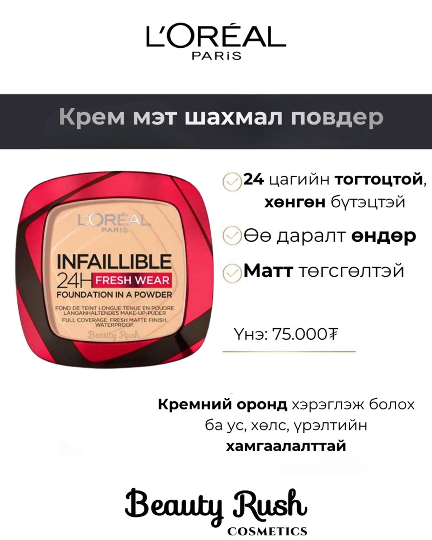 Нэг бүтээгдэхүүнээр арьсаа жигд болгож, өөг дарж матт, цэвэрхэн look гаргаарай🥰Хөнгөн бүтэцтэй ч сайн өөг дарж, өдөржин өглөө будаад гарсан шигээ гоёоороо🤩
